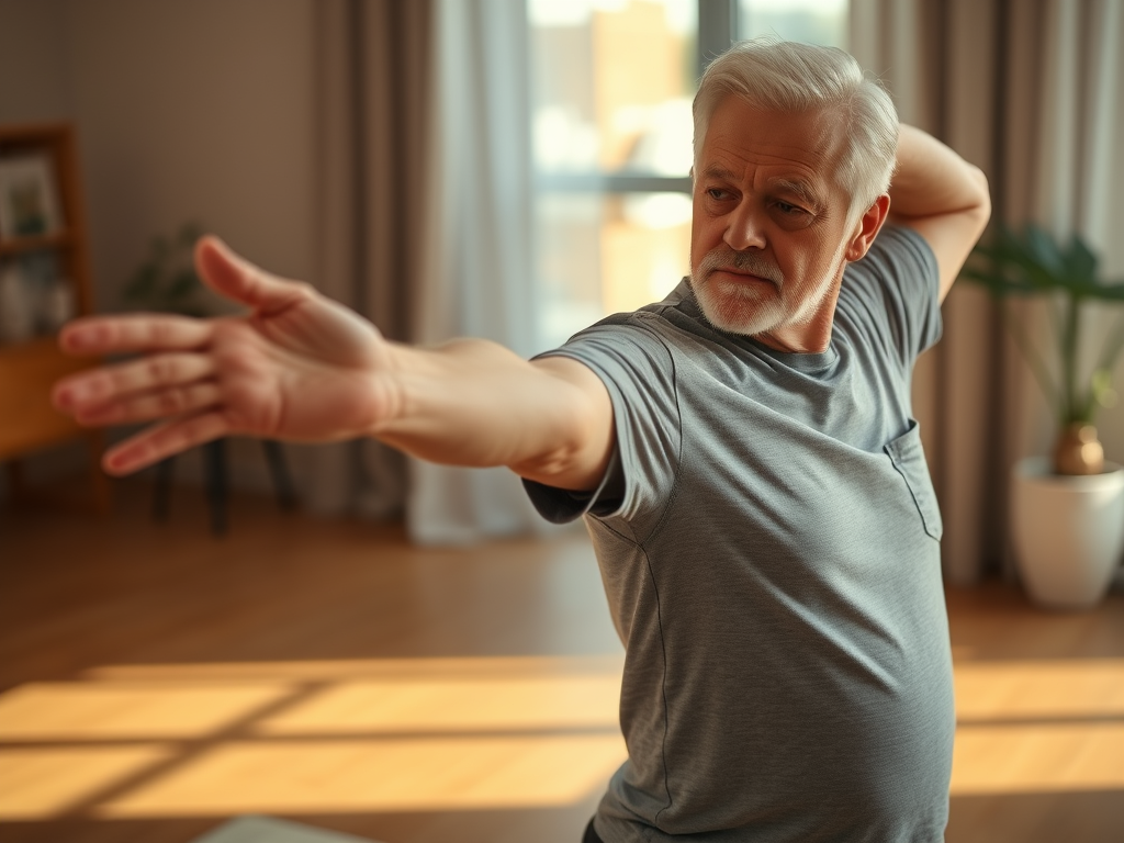 My morning stretches, my knees are a little sore today. They say that the older you get, the less your body listens to you, but you shouldn’t give up, right? Especially for us seniors, we need to take care of ourselves.